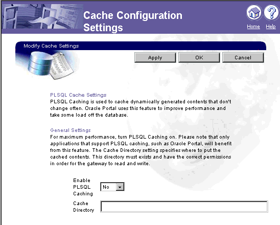 This page is split into two subsections for the two types of caching: PL/SQL caching and Session Cookie caching. A section of the Cache Settings page is shown below.