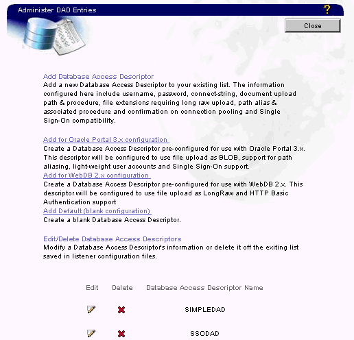The PL/SQL Gateway provides a Web page for configuring Database Access Descriptors (DADs). A DAD is a set of values that specify how the PL/SQL Gateway connects to a database server to fulfill an HTTP request.